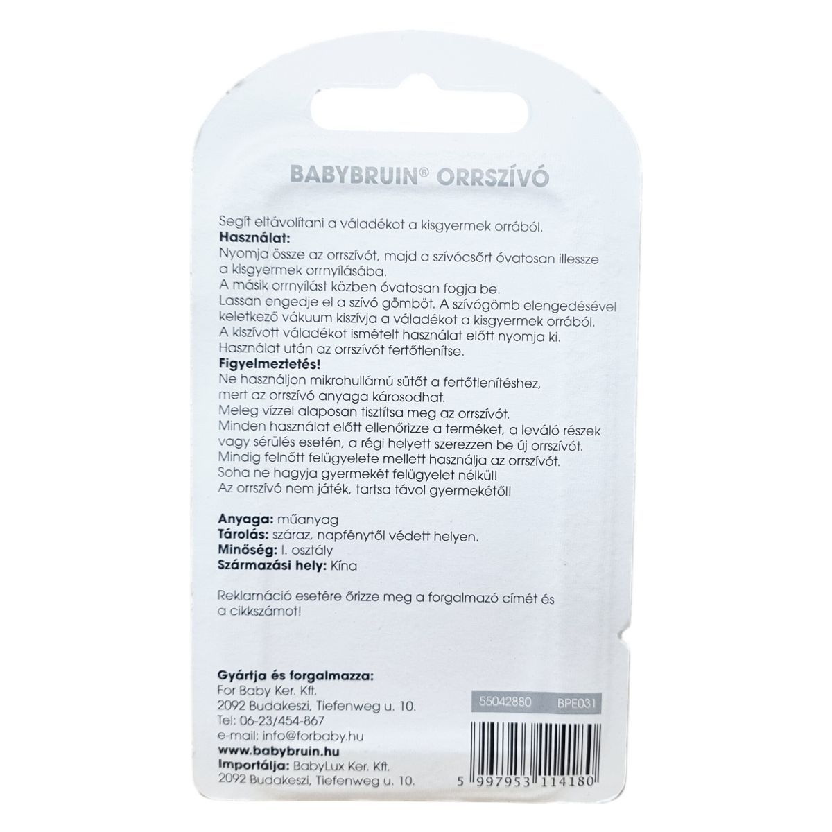 I. osztályú minőségű Baby Bruin orrszívó, amely kisgyermekek orrából segít eltávolítani a váladékot. Anyaga műanyag, származási helye Kína. Reklamáció esetén meg kell őrizni a forgalmazó adatait és a cikkszámot. Az importőr BabyLux Ker. Kft.