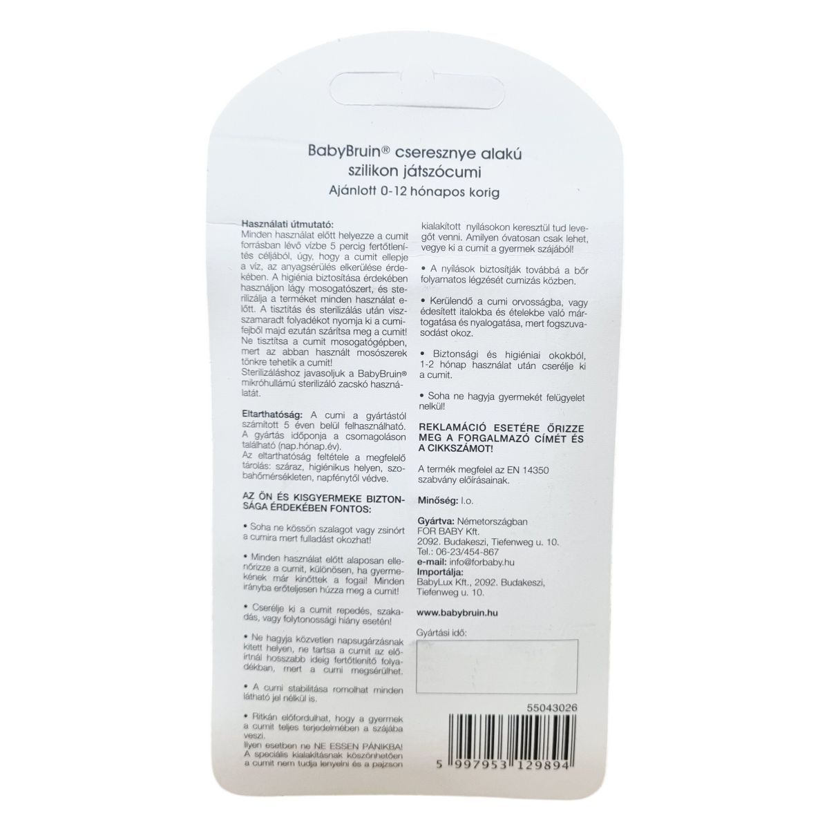 A BabyBruin® cseresznye alakú szilikon játszócumi 0–12 hónapos korú gyermekek számára ajánlott. A cumi a gyártástól számított 5 éven belül felhasználható. A gyártás időpontja a csomagoláson kerül feltüntetésre. A speciális kialakítás megakadályozza a lenyelést, a pajzson kialakított nyílások pedig lehetővé teszik a levegővételt és a bőr folyamatos légzését cumizás közben. Minősége I. osztály. Gyártva Németországban. Importőr: BabyLux Kft.