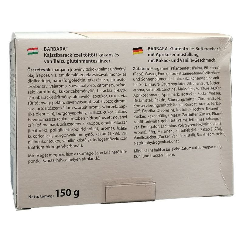 Töltetlen illetve töltött süteményeink közül egyaránt válogathatnak a lisztérzékenyek. Praktikus visszazárható csomagolás, viszonylag hosszú minőség megőrzési idő jellemzi ezeket a termékeket. Nettó tömeg: 180 g. Not. Szám: 1124/2006. Tápérték 100 gramm késztermékben: Energiatartalom: 1910 kJ (455 kcal), Fehérje: 2, 8 g, Szénhidrát: 64, 5 g, Zsír: 20, 7 g. Minőségét megőrzi: 6 hónapig.