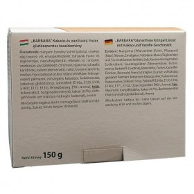 Töltetlen illetve töltött süteményeink közül egyaránt válogathatnak a lisztérzékenyek. Praktikus visszazárható csomagolás, viszonylag hosszú minőség megőrzési idő jellemzi ezeket a termékeket. Nettó tömeg: 180 g. Not. Szám: 734/D. Tápérték 100 gramm késztermékben: Energiatartalom: 2074 kJ (494 kcal), Fehérje: 4, 0 g, Szénhidrát: 56, 6 g, Zsír: 28, 2 g. Minőségét megőrzi: 3 hónapig.