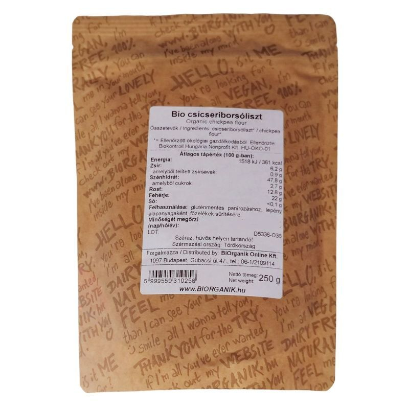 Összetevők: csicseriborsó liszt Ellenőrzött Ökológiai Gazdálkodásból HU-ÖKO-01. Ellenőrizte: Biokontroll Hungária Nonprofit Kft.