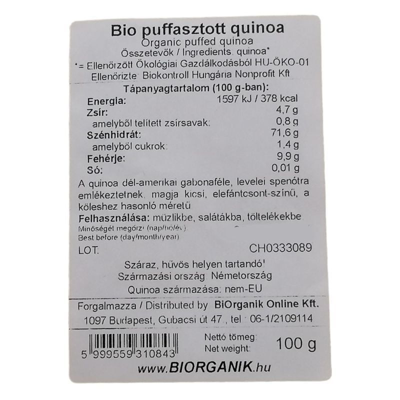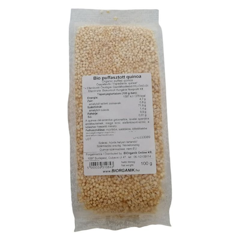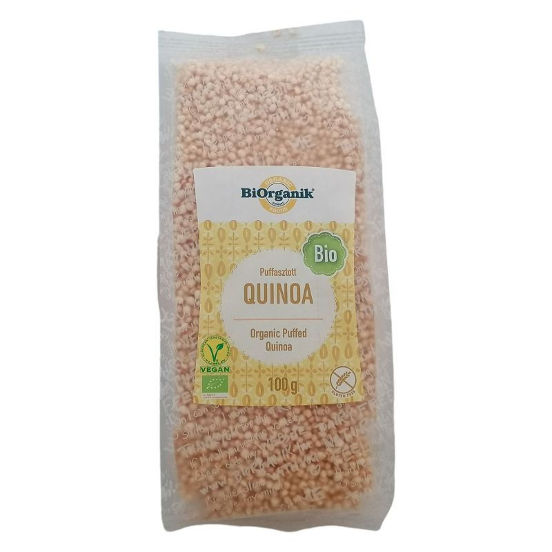 180 centisre is megnő, levelei spenótra emlékeztetnek, a magokat a szár csúcsán hozza ez a számunkra - még - ismeretlen növény. Magja kicsi, elefántcsont-színű, és a köleshez hasonló méretű gyöngyszemecske. Felhasználása: müzlikbe, salátákba, töltelékekbe. Elkészítése: magában fogyasztható. Összetevők: bio puffasztott quinoa Ellenőrzött Ökológiai Gazdálkodásból HU-ÖKO-01. Ellenőrizte: Biokontroll Hungária Nonprofit Kft.