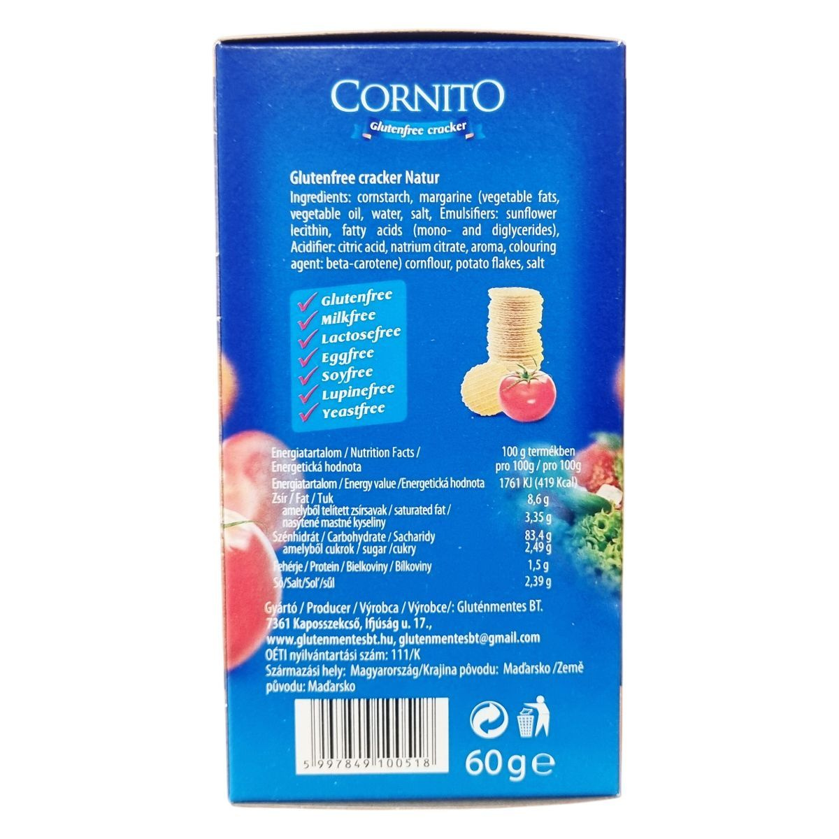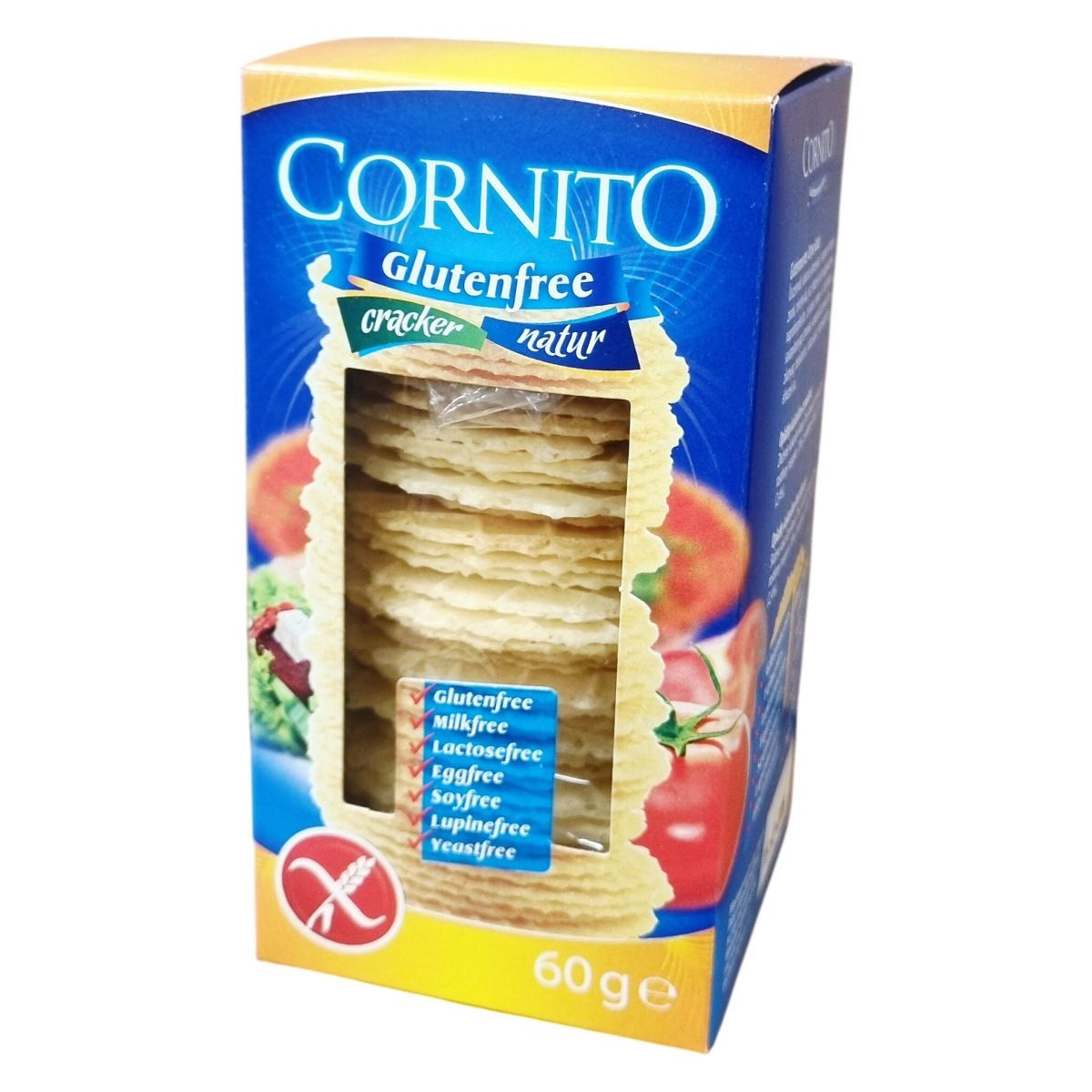 A Cornito gluténmentes ostya natúr egy könnyű, ropogós termék, amely kukoricakeményítőből és burgonyapehelyből készül, növényi margarinnal ízesítve és tartósítva. Az ostya mentes a leggyakoribb allergénektől, így széles körben fogyasztható különféle mentességi igények mellett. A termék Magyarországról származik, és a gyártó precíz minőségellenőrzés mellett készíti el. Az ostya jól alkalmazható snackként, vagy más ételekhez kiegészítőként, különösebb előkészítést nem igényel.