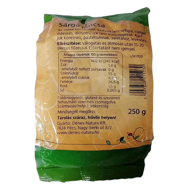 Ajánljuk köretként, pástétomnak, salátához, leveshez. Főzési idő: 5-10 perc. Összetevők: sárga lencse. Átlagos tápanyagtartalom 100g termékben: energiatartalom: 1441 kJ/340 kcal, fehérje: 24,7 g, szénhidrát: 22g, zsír: 1,1g.