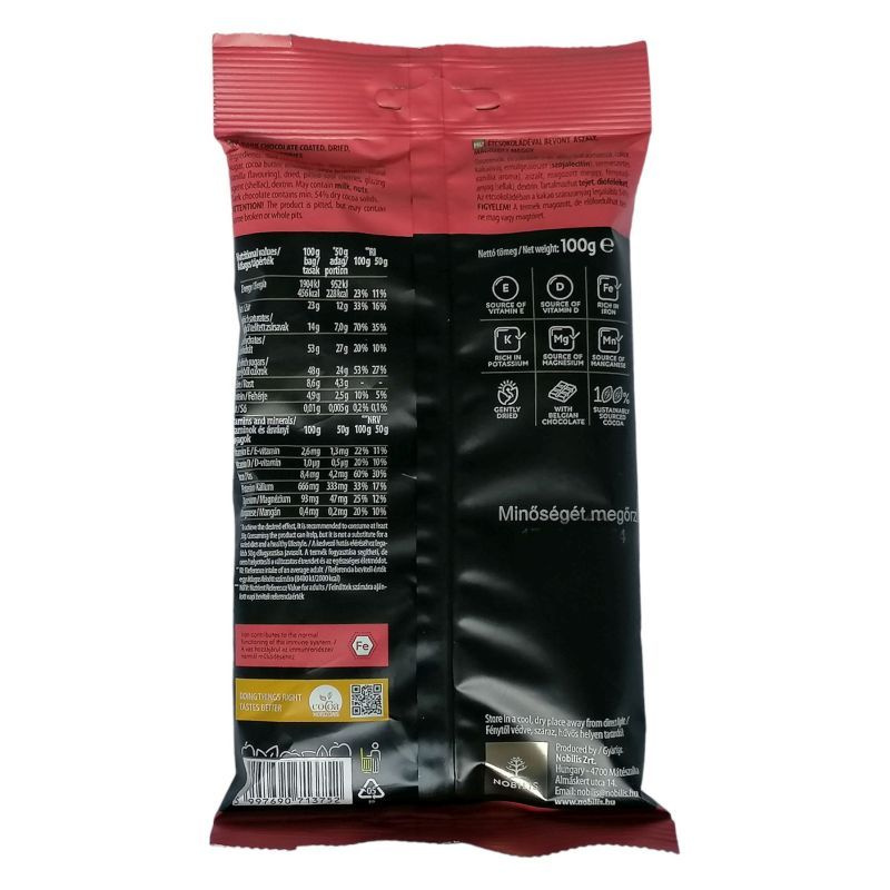 Összetevők: Étcsokoládé min.: 50% (kakaómassza, cukor, kakaóvaj, emulgeálószer: szójalecitin, aroma), aszalt, magozott meggy, fényezőanyag: sellak, keményítő.