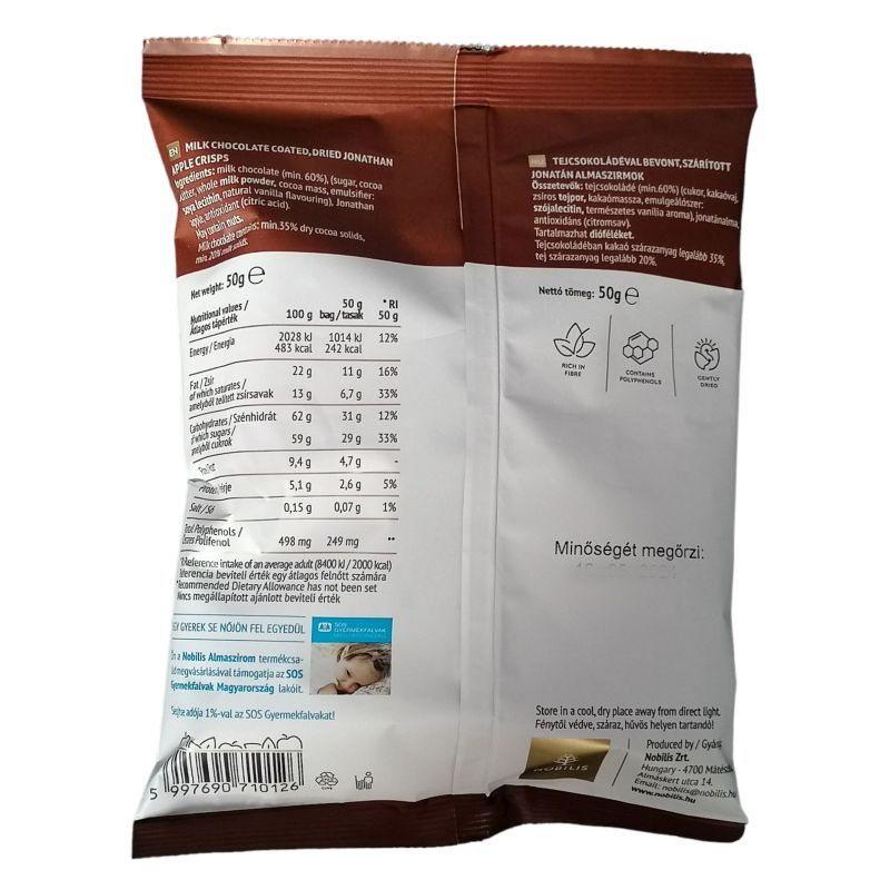 Hogy mindkét fél boldog legyen, mi ötvöztük a gyerekek és az anyák kívánságát az új csokoládés almasziromban. A recept egyszerű: a már jól ismert jonatánalmából készült almaszirmokhoz adtunk egy vékony tejcsokoládé-réteget. A könnyű, ropogós almaszirom jóízű párost alkot a tápláló csokoládéval. Az almaszirom koncentráltan tartalmazza a friss alma jótékony hatásait, míg a csokoládé erőt ad, fokozza az agyműködést és élénkíti a vérkeringést. Igazi csemege a gyerekek és az édesszájú felnőttek számára, akik szeretnének elindulni az egészséges táplálkozás útján.