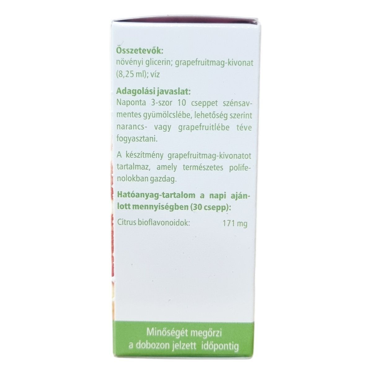 Gyermekek elől elzárva tartandó! Az ajánlott fogyasztási mennyiséget ne lépje túl! A készítmény nem helyettesíti a kiegyensúlyozott vegyes étrendet, illetve az egészséges életmódot. Keserű ízű, ezért csak hígított formában alkalmazható! Tömény formában a nyálkahártyát irritáló hatású lehet. A grapefruitmag egyik hatóanyaga gyógyszer-metabolizáló enzim-bénító hatású, így jelentősen növelheti egyes gyógyszerek hatását, ezért gyógyszert rendszeresen szedők konzultáljanak kezelőorvosukkal. Használat előtt felrázandó!