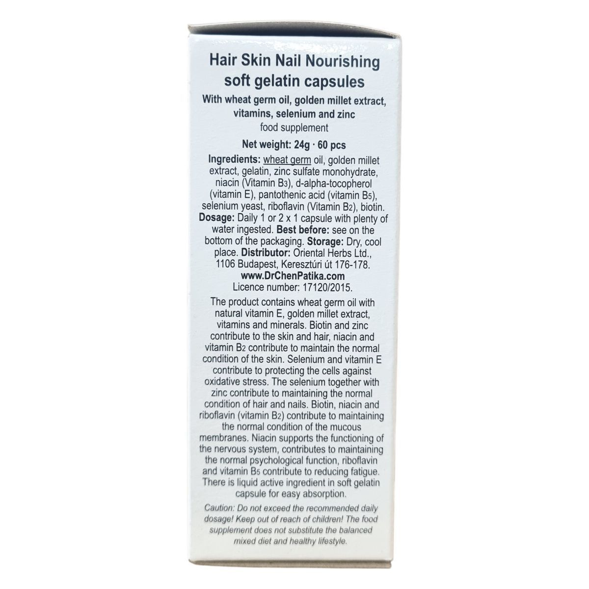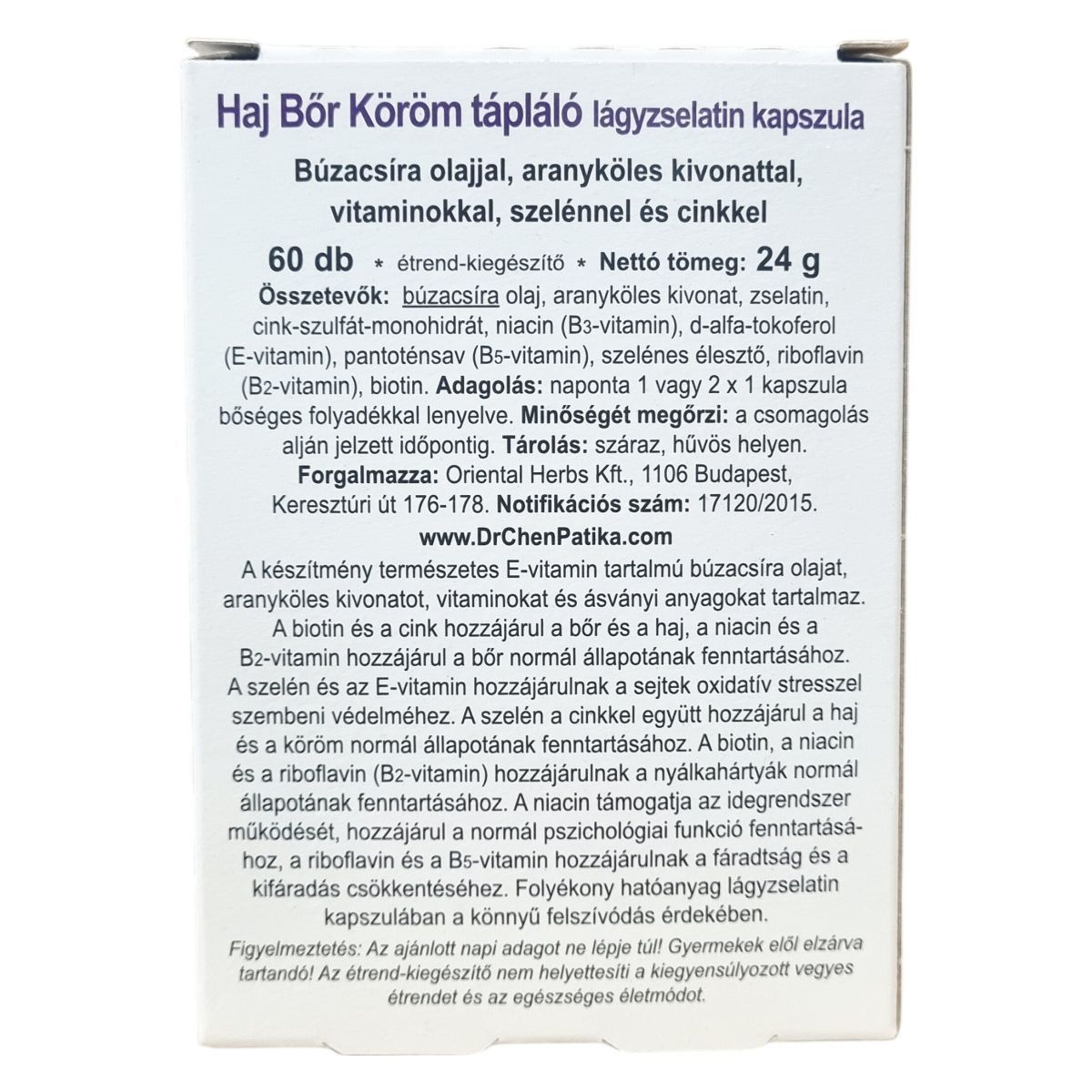 A Dr.Chen Haj Bőr Köröm tápláló lágyzselatin kapszula természetes E-vitamin tartalmú búzacsíra olajat, aranyköles kivonatot, vitaminokat és ásványi anyagokat tartalmaz. A biotin és a cink hozzájárulhat a bőr és a haj, míg a niacin és a B2-vitamin a bőr normál állapotának fenntartásához. A szelén és az E-vitamin együtt hozzájárulhatnak a sejtek oxidatív stresszel szembeni védelméhez, valamint a szelén a cinkkel együtt a haj és a köröm normál állapotának fenntartásához. A biotin, a niacin és a riboflavin (B2-vitamin) támogathatják a nyálkahártyák normál állapotának fenntartását. A niacin segítheti az idegrendszer működését, hozzájárulhat a normál pszichológiai funkció fenntartásához, míg a riboflavin és a B5-vitamin csökkenthetik a fáradtságot és a kifáradást. A készítmény hatóanyagai lágyzselatin kapszulában találhatók, amelyek a könnyű felszívódást szolgálják.