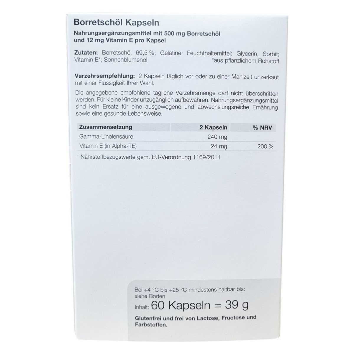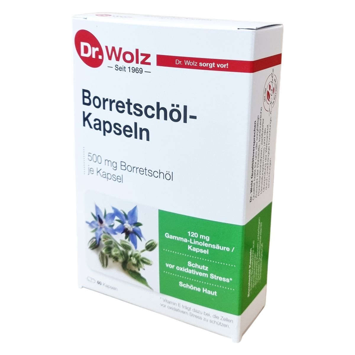 A Dr. Wolz Borretschöl-Kapseln tiszta borrágóolajat tartalmaznak, amely a borrákszemekből készül. Egy kapszula 500 mg borrágóolajat, ebből 120 mg gamma-linolénsavat és 12 mg E-vitamint tartalmaz, mely utóbbi hozzájárulhat a sejtek oxidatív stresszel szembeni védelméhez. A kapszulák glutén-, laktóz-, fruktóz- és színezékmentesek. A termék minőségét a gondos alapanyagválasztás, rendszeres szennyezőanyag-elemzések, tanúsított gyártási folyamat és független kutatóintézetek által végzett hatásvizsgálatok biztosítják. A napi ajánlott fogyasztás 2 kapszula, amelyet étkezéshez javasolt bevenni, egy pohár vízzel. Az étrend-kiegészítő nem helyettesíti a kiegyensúlyozott étrendet és az egészséges életmódot. A termék OETTI engedélyszámmal rendelkezik, továbbá a tárolás +4 °C és +25 °C között javasolt.