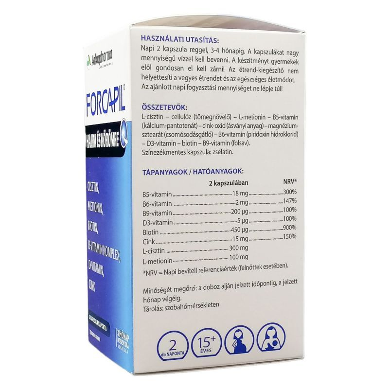 A Forcapil oldat vagy a Forcapil kapszula önálló kezelésre is alkalmas, de egyidejű alkalmazásuk növeli a hatékonyságot. Egy kezeléshez a 60 darabosból három ajánlott, a 180-as egy teljes kúrát tartalmaz. A hatás észleléséhez legalább kéthónapos kezelés szükséges az előírt adagolás szerint. Figyelmeztetés: Az ajánlott adagnál többet nem szabad bevenni! Az étrend-kiegészítő nem helyettesíti a vegyes étrendet és az egészséges táplálkozást! A készítményt gyermekek elől gondosan el kell zárni! Tartalmaz: DL-methionint, L-cisztint, vitaminokat (B5, B6, biotin), cink-pidolátot. Összetevők: DL-methionint, L-cisztint, vitaminokat (B5, B6, biotin), cink-pidolátot tartalmaz
