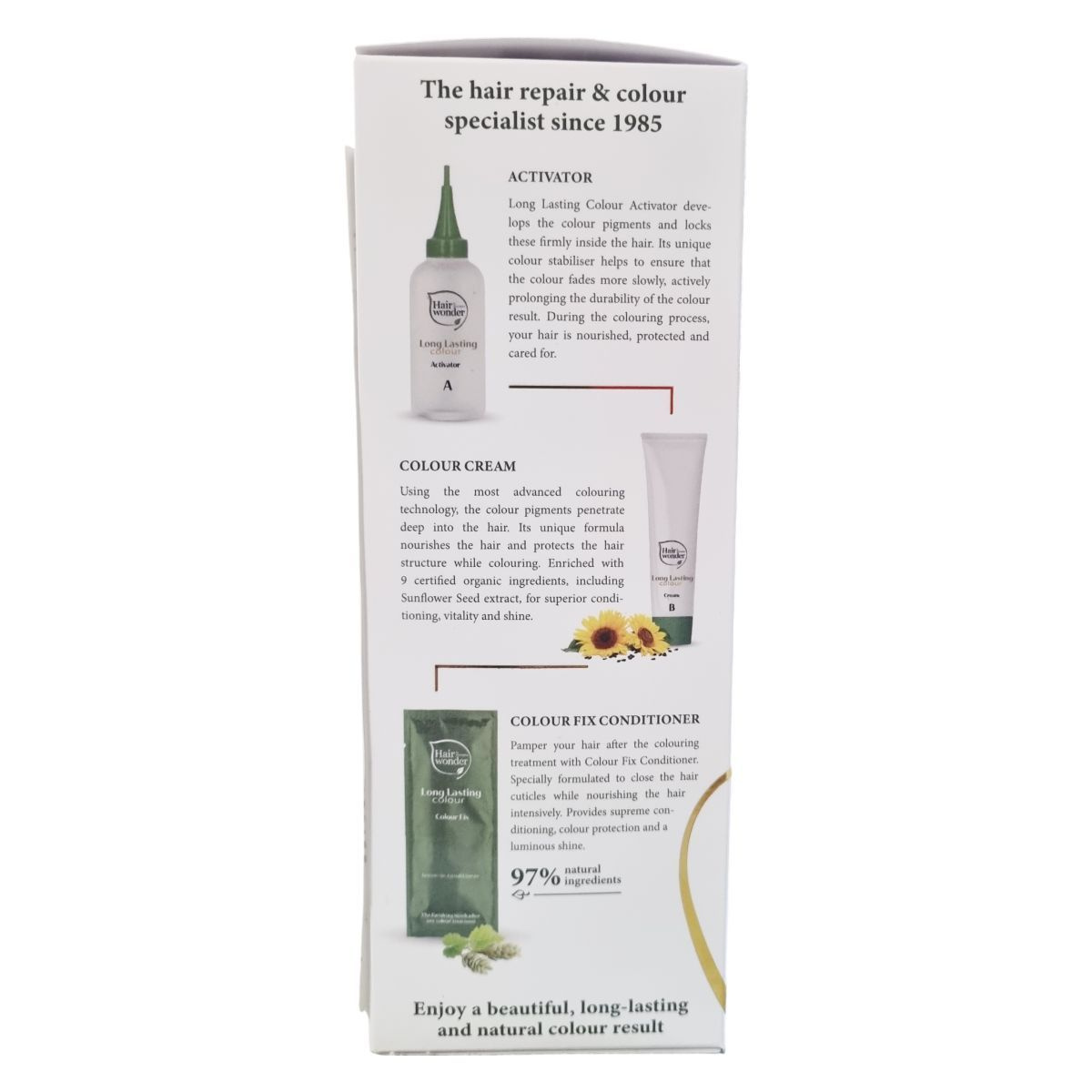 A tartós hajfesték 100%-os őszhajszál-fedést biztosíthat, hosszú ideig tartó színnel és természetes hatású eredménnyel. A formula UV-hajvédő tulajdonságokkal rendelkezik, valamint fényt és ápolást ad a hajnak.