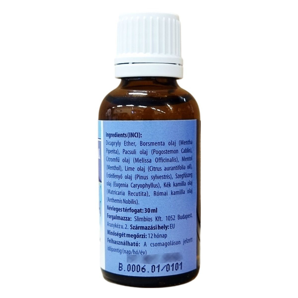 Dicaprylyl Ether, Borsmenta olaj (Mentha Piperita), Pacsuli olaj (Pogostemon Cablin), Citromfű olaj (Melissa Officinalis), Menthol, Lime olaj (Citrus aurantifolia oil), Erdei fenyő olaj (Pinus sylvestris), Szegfűszeg olaj (Eugenia Caryophyllus), Kék kamilla olaj (Matricaria Recutita), Római kamilla olaj (Anthemis Nobilis).