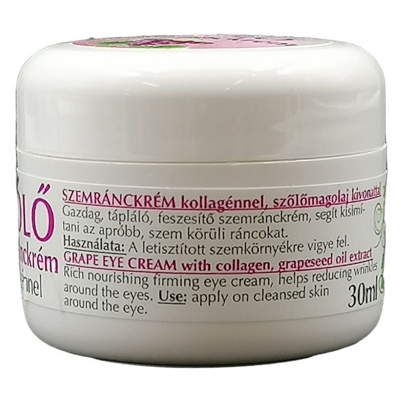 A szőlő értékes magolaja regenerálja a bőrt, gátolja a ráncképződést. Gazdag, tápláló, feszesítő szemránckrém kollagén, szőlőmagolaj kivonat és E-vitamin tartalommal.