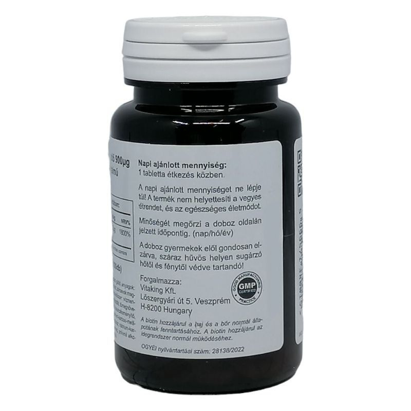 A biotin megtalálható számos kozmetikai termékben, amit a haj, a köröm és a bőr kezelésére fejlesztettek ki. Gyakran ajánlják étrend-kiegészítőként is a haj, a bőr és a köröm erősítésére. A biotin hiánybetegségének leggyakoribb tünetei: Hajhullás (alopecia) Krónikus kötőhártya-gyulladás Dermatitisz formájában hámló bőr (vörös kiütések a szem körül, az orr, a száj és a nemi szervek területén) Neurológiai tünetek felnőtteknél, mint a depresszió, levertség, hallucináció, zsibbadás és bizsergés a végtagokban A biotin számos nyers ételben megtalálható. 100 fok feletti hőmérsékleten elbomlik, emiatt a főtt ételekben előfordul, de magasabb hőmérsékleten sültekben nem. Jelentős biotin-tartalmú étel a mángold, nyers tojássárgája, a máj és a leveles zöldségek. Felszívódását és hasznosulását befolyásolják az ételben megtalálható fehérjék. Például a nyers tojás fehérjéje teljesen semlegesíti a sárgájában található biotint. A biotin az alábbi élettani folyamatokban játszik fontos szerepet: részt vesz a normál energiatermelő anyagcsere-folyamatokban. hozzájárul az idegrendszer normál működéséhez. részt vesz a makro tápanyagok normál anyagcseréjében. hozzájárul a normál pszichológiai funkció fenntartásához. hozzájárul a haj és a bőr normál állapotának fenntartásához. hozzájárul a nyálkahártyák normál állapotának fenntartásához. OÉTI bejegyzési szám: 14095/2014 Napi ajánlott mennyiség: 1 tabletta