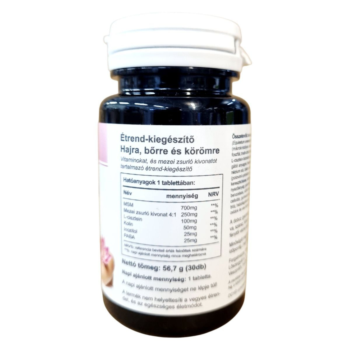 A Vitaking HAIR, SKIN & NAILS étrend-kiegészítő speciális formulája vitaminokat és mezei zsurló kivonatot tartalmaz, amelyek hozzájárulhatnak a haj, bőr és köröm egészséges állapotának fenntartásához. A termék MSM-et, L-ciszteint, kolint, inozitolt és PABA-t is tartalmaz, amelyek különféle módon támogathatják a szervezetet. A termék napi ajánlott mennyisége 1 tabletta, amelyet nem szabad túllépni. A termék nem helyettesíti a vegyes étrendet és az egészséges életmódot, és gyermekek elől gondosan elzárva, hűvös, fénytől védett helyen tárolandó.