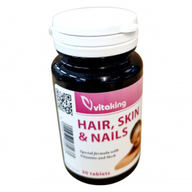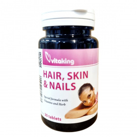 A Vitaking HAIR, SKIN & NAILS étrend-kiegészítő vitaminokat és mezei zsurló kivonatot tartalmaz, amelyek hozzájárulhatnak a haj, bőr és köröm egészséges állapotának fenntartásához.