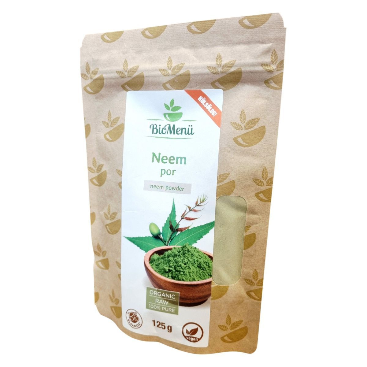 A BioMenü BIO NEEM por egy 100% tiszta, organikus és nyers termék, amelyet külsőleg alkalmazhatunk különféle bőrápolási célokra. Az indiai neem fa leveleiből készült por természetes módon segíthet a bőr és a fejbőr ápolásában. A termék bio és vegán minősítésű, és Indiából származik. A neem por alkalmazása egyszerű: keverje össze citromlével és forró vízzel, majd vigye fel a bőrre. A terméket jól zártan, száraz, hűvös helyen kell tárolni, gyermekektől elzárva. A forgalmazó a Caleido IT-Outsource Kft., amely Budapesten található.