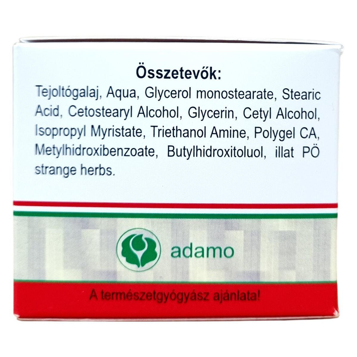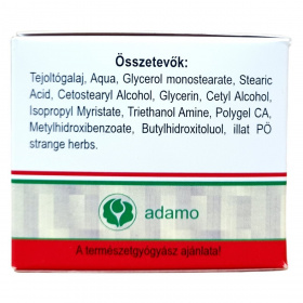 Tejoltógalaj, Aqua, Glycerol monostearate, Stearic Acid, Cetostearyl Alcohol, Glycerin, Cetyl Alcohol, Isopropyl Myristate, Triethanol Amine, Polygel CA, Metylhidroxibenzoate, Butylhidroxitoluol, illat PÖ strange herbs.