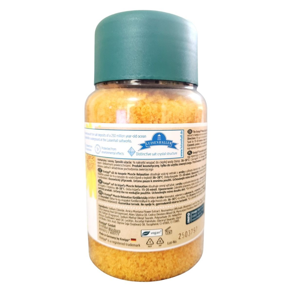A Kneipp Mineral Bath Salt Muscle Relaxation fürdősó különleges összetevői, mint az árnika-kivonat és a természetes illóolajok, segítenek az izmok ellazításában és a feszültség oldásában. A termék 250 millió éves óceán sólerakódásaiból származó tengeri sót tartalmaz, amelyet a Luisenhall sólepárlóban nyernek ki. A fürdősó használata egyszerű: a kupakot 3/4-ig töltse meg a sóval, és adja hozzá a meleg fürdővízhez, majd élvezze a 15–20 perces pihentető fürdőt. A termék vegán, és nem tartalmaz állati eredetű összetevőket, így ideális választás azok számára, akik természetes és etikus kozmetikumokat keresnek.
