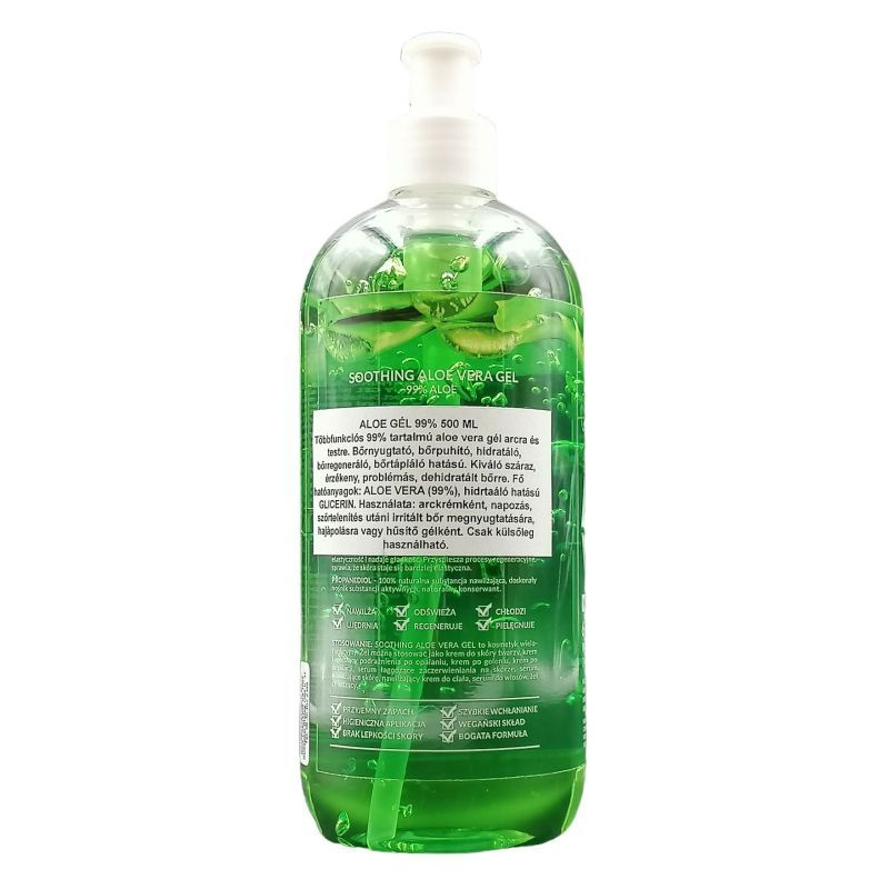 Többfunkciós 99% tartalmú aloe vera gél arcra és testre. Bőrnyugtató, bőrpuhító, hidratáló, bőrregeneráló, bőrtápláló hatású. Kiváló száraz, érzékeny, problémás, dehidratált bőrre. Fő hatóanyagok: ALOE VERA (99%), hidratáló hatású GLICERIN. Használata: arckrémként, napozás, szőrtelenítés utáni irritált bőr megnyugtatására, hajápolásra vagy hűsítő gélként. Csak külsőleg használható.