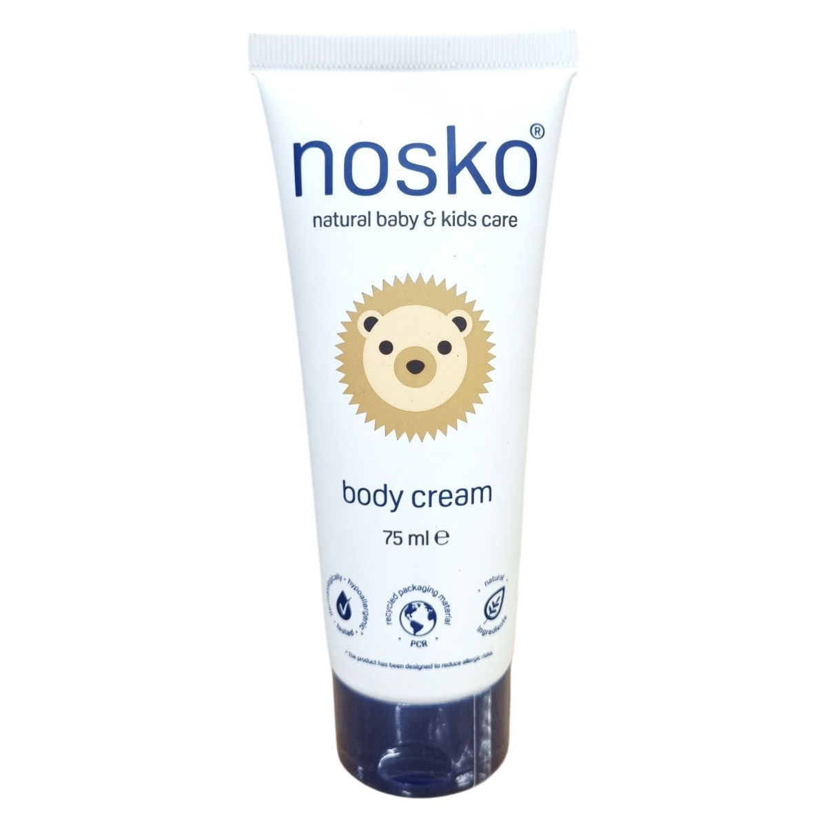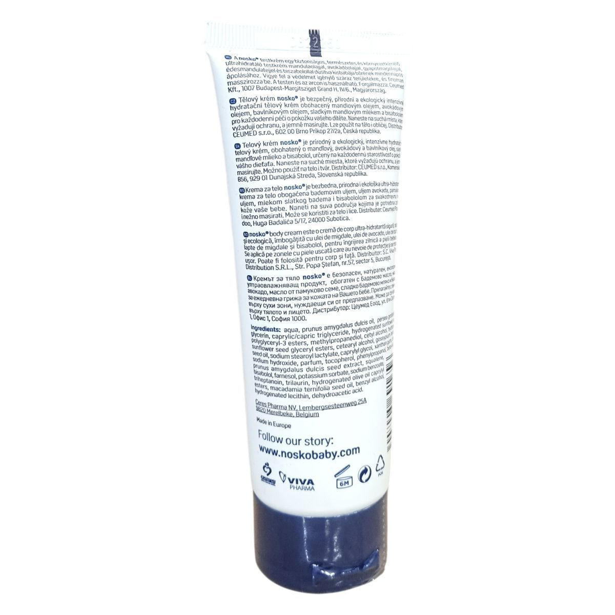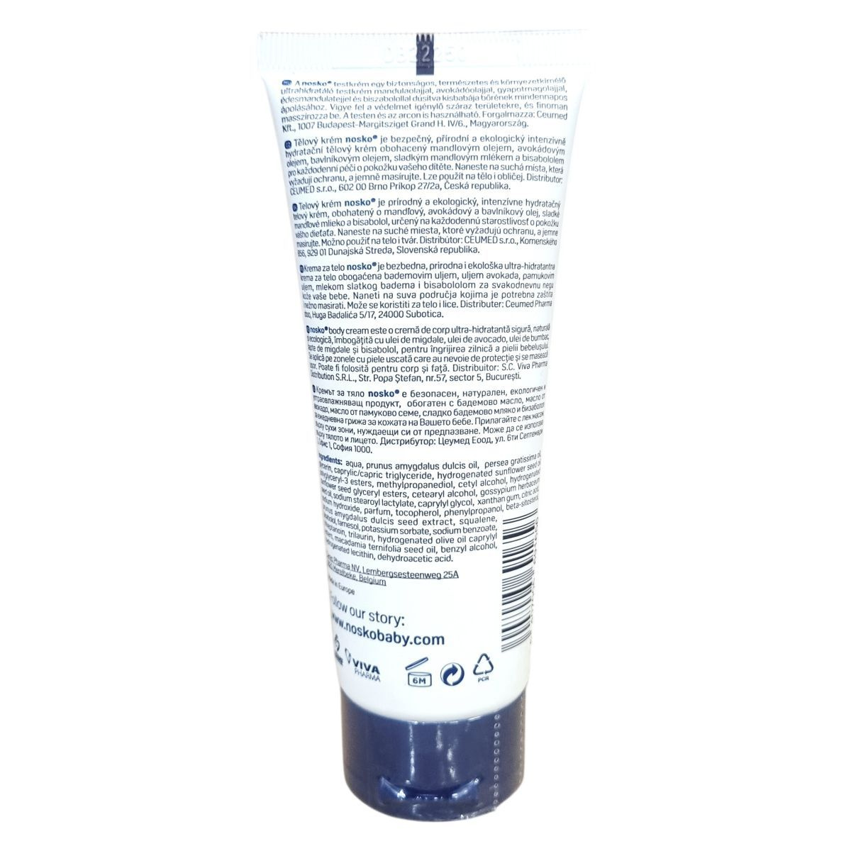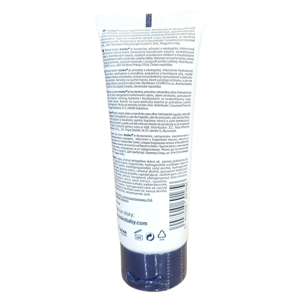 A nosko® testkrém egy természetes és környezetbarát, ultrahidratáló kozmetikum, mely gondosan válogatott növényi olajokat tartalmaz, mint a mandula-, avokádó- és gyapotmagolaj, valamint édesmandulatejet és biszabololt. Ezek a hatóanyagok segítenek hidratálni és ápolni a kisbaba kényes bőrét. A krém biztonságos használatra készült, így a test bármely részén, akár az arcon is alkalmazható a száraz, védelmet igénylő bőrfelületeken. A termék Európában készült, és hozzájárul a környezet védelméhez is, melyet a természetes összetevők és az öko-szemlélet támogatnak. Különösen ajánlott a mindennapi bőrápolás részeként a baba bőrének megóvására.
