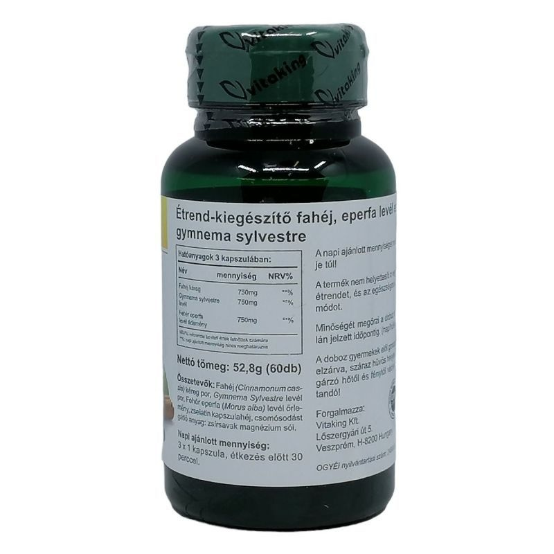 Ezek alapján elmondható, hogy elsősorban cukorbetegeknek ajánlott rendszeresen fogyasztani. Szakértők javaslata alapján legalább napi 1 grammot célszerű fogyasztani belőle. A Gymnema Sylvestre-t sokan csak cukorgyilkos gyógynövényként emlegetik. Nem véletlenül terjedt el a növénnyel kapcsolatban ez az elnevezés. A gymnema hatása a szervezetre: Segíthet a súlycsökkentő programokban, mint természetes étvágycsökkentő. Segít fenntartani az egészséges étvágy mértékét. Elősegítheti a vér normális cukorszintjét. A készítmény harmadik összetevője a fehér eperfa levél. Ez a nagyhatású növény nálunk még nem túl ismert, a hagyományos kínai és japán természetgyógyászat azonban évszázadok óta használja. Ez is bizonyítja hatékonyságát. az eperfa levél kivonata hozzájárulhat a szervezet szénhidrát-anyagcsere egyensúlyának fenntartásához Napi ajánlott mennyiség: 3 kapszula OÉTI bejegyzési szám: 12469/2013 A felhasználási javaslatban megadott mennyiséget ne lépje túl! A termék nem helyettesíti a vegyes étrendet és az egészséges életmódot. A doboz gyermekek elől gondosan elzárva tartandó!