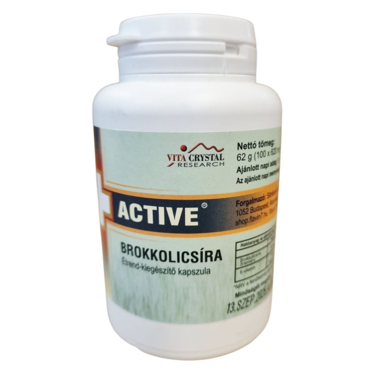 A VITA ACTIVE BROKKOLICSÍRA étrend-kiegészítő kapszula brokkolicsíra őrleményt és E-vitamint tartalmaz, amely hozzájárulhat a sejtek oxidatív stresszel szembeni védelméhez. A termék napi háromszori fogyasztása javasolt, és fontos, hogy az ajánlott napi mennyiséget ne lépje túl. A kapszula összetevői között megtalálható a cirok mag-héj őrlemény, HPMC kapszula, cink-oxid, sűrítőanyag, emulgeálószer és E-vitamin-acetát. Az étrend-kiegészítő nem helyettesíti a kiegyensúlyozott vegyes étrendet és az egészséges életmódot, ezért fontos, hogy kisgyermekektől elzárva, száraz, hűvös helyen tároljuk.