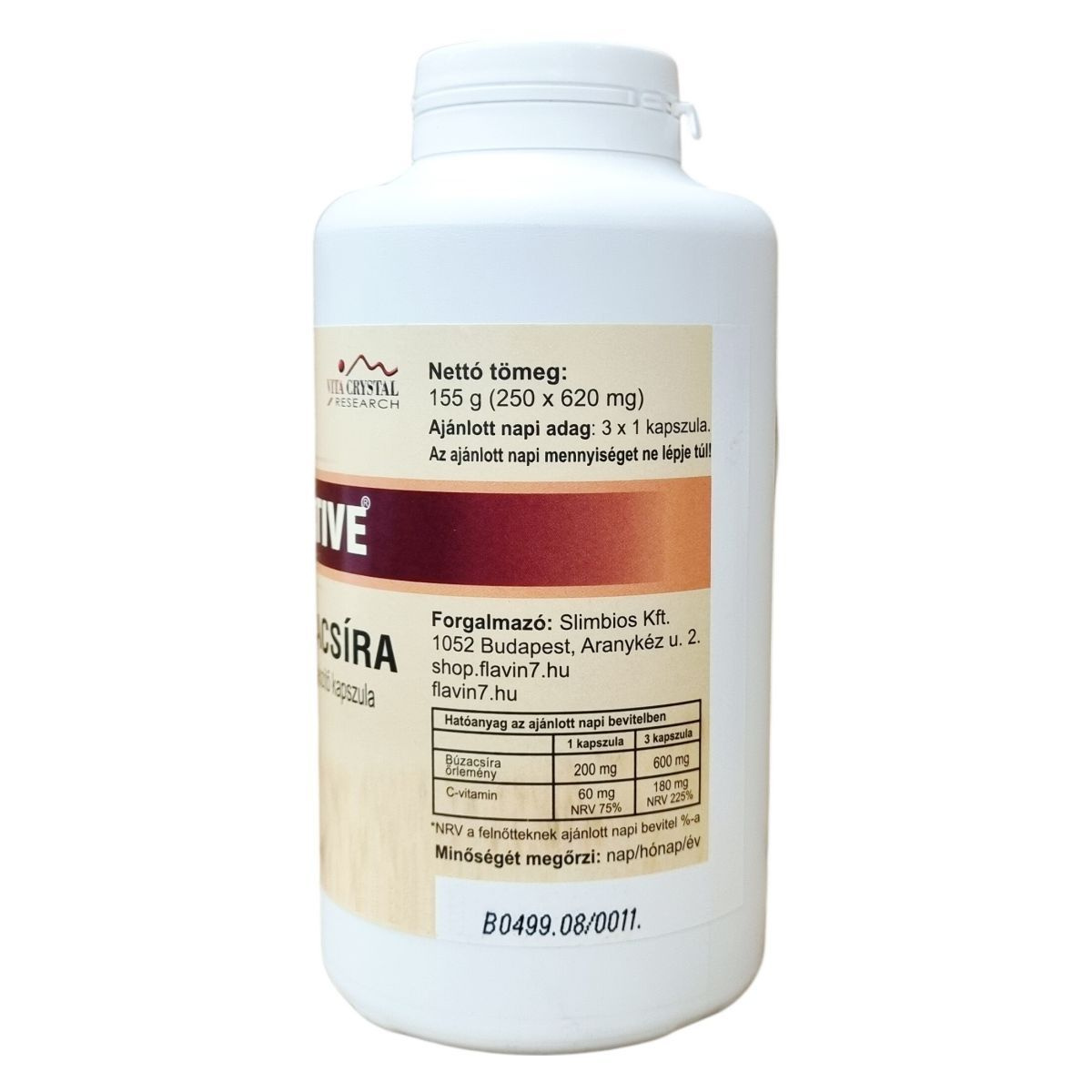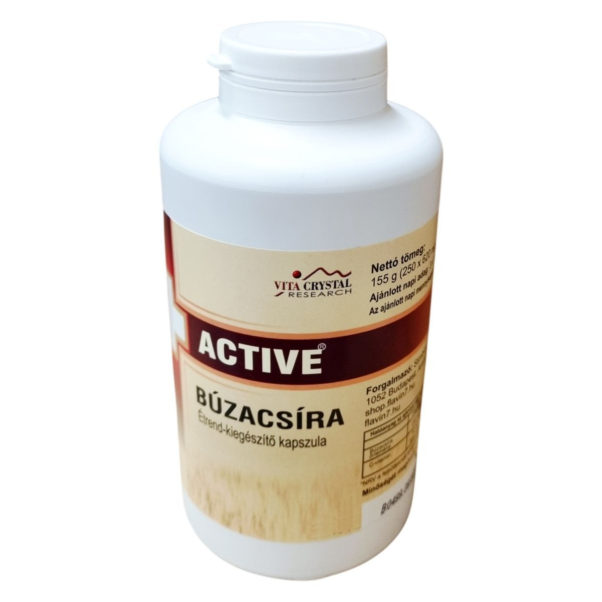 A VITA CRYSTAL ACTIVE® Búzacsíra étrend-kiegészítő kapszula cirok mag-héj őrleményből, búzacsíra őrleményből és C-vitaminból álló összetétel, mely kapszula formában kerül forgalomba. A termék 250 darab, egyenként 620 mg-os kapszulát tartalmaz, nettó tömege 155 gramm. A C-vitamin szerepe az immunrendszer támogatása és a sejtek védelme oxidatív stressz ellen lehet. A termék szedése javasolt naponta három kapszula, kizárólag a megadott mennyiségben. Az összetevők között megtalálható a hipromellózból készült kapszula, valamint cink-oxid, sűrítőanyag és emulgeálószer is. A termék kizárólag étrend-kiegészítőként használható, nem helyettesíti a kiegyensúlyozott étrendet és az egészséges életmódot, valamint kisgyermekek elől elzárva kell tartani. A csomagoláson feltüntetett minőségmegőrzési időn túl a termék használata nem javasolt.