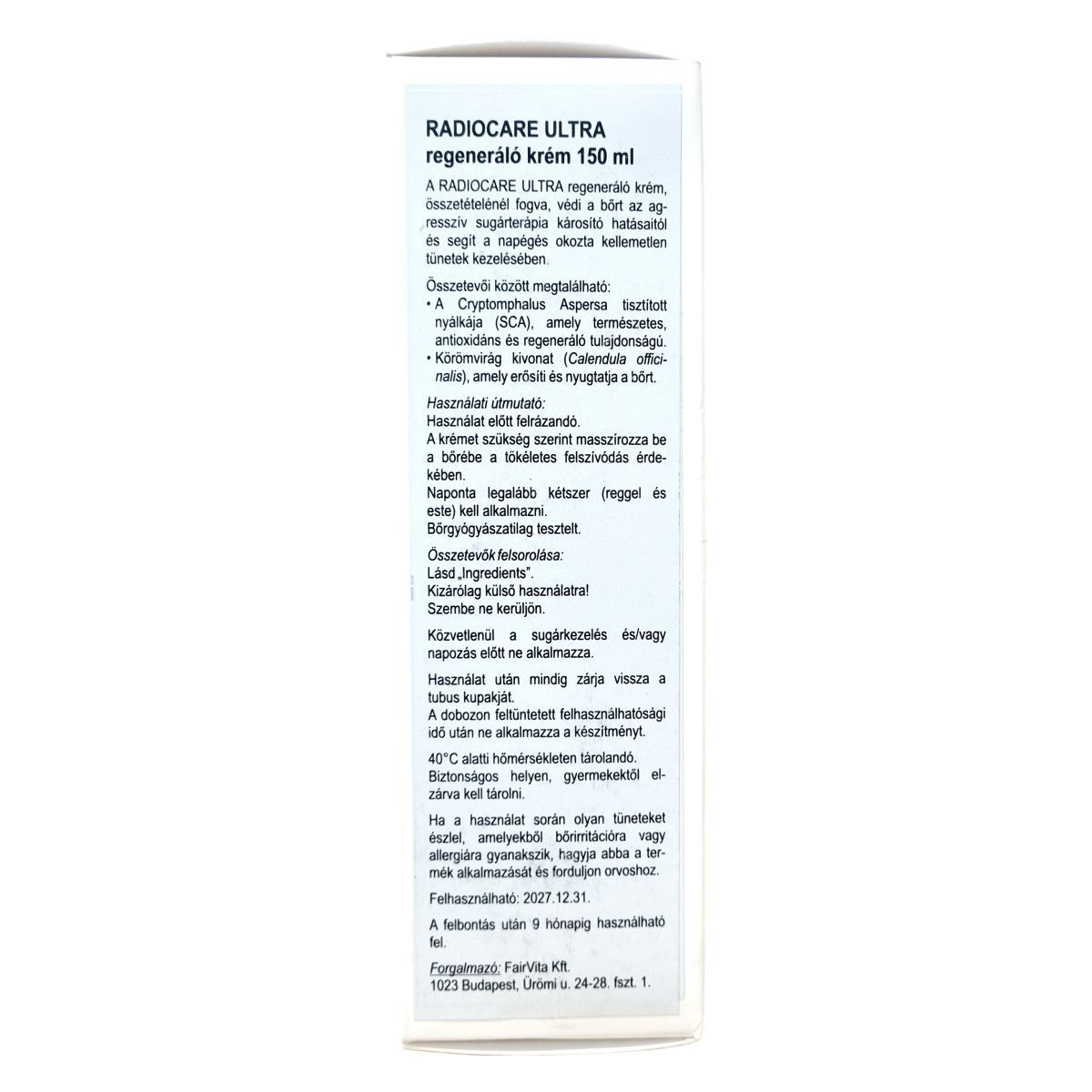 A RadioCare Ultra egy speciálisan sugárterápiák után kifejlesztett bőrvédő és regeneráló krém. Hatékonyságát a SCA® nevű természetes aktív összetevő antioxidáns és regeneráló hatásának, valamint a körömvirág (Calendula officinalis) nyugtató, helyreállító tulajdonságainak köszönheti. Használata javasolt reggel és este, felrázás után, bőrbe masszírozva a teljes felszívódásig. A termék kizárólag külsőleg alkalmazható, kerülni kell a szemmel való érintkezést, és nem ajánlott közvetlenül sugárkezelés vagy napozás előtt használni. Parabénmentes és bőrgyógyászatilag tesztelt. Gondos tárolás mellett, 40°C alatt, gyermekek elől elzárva biztosítható a minősége.