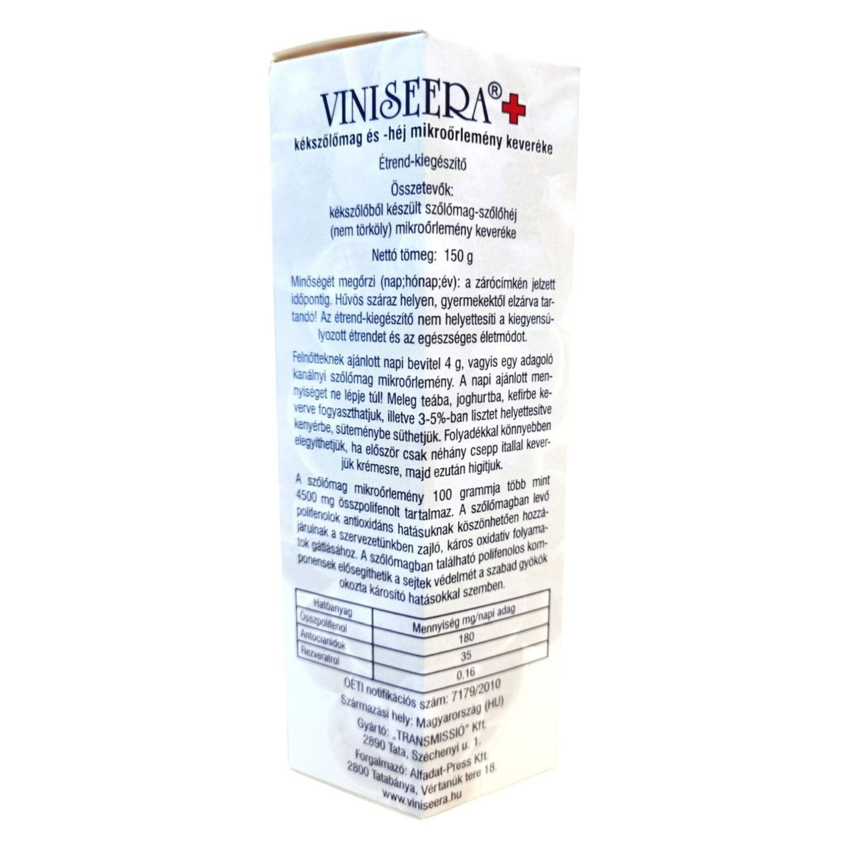 A VINISEERA+ kékszőlőmag és -héj mikroőrlemény egy természetes antioxidánsokat tartalmazó étrend-kiegészítő, amely Magyarországon készül. A termék fő összetevője a kékszőlőből készült szőlőmag-szőlőhéj mikroőrlemény, amely nem törkölyből készül. A termék több mint 4500 mg összpolifenolt tartalmaz 100 grammjában, amelyek antioxidáns hatásuk révén hozzájárulhatnak a szervezet oxidatív folyamataival szembeni védelemhez. A termék különféle italokba és ételekbe keverhető, így könnyen beilleszthető a napi étrendbe.