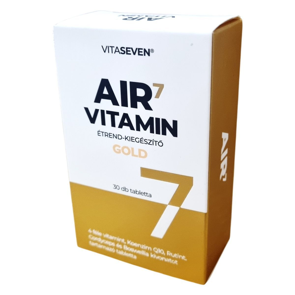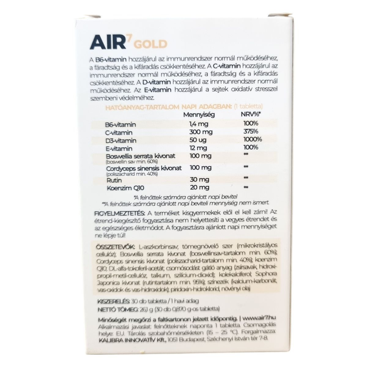 Az AIR7 GOLD étrend-kiegészítő tabletta 30 darabos kiszerelésben készül és tartalmaz 4 féle vitamint, nevezetesen B6, C, D3 és E vitamint, valamint különleges kivonatokat, mint a Boswellia serrata és Cordyceps sinensis kivonat. Ezek mellett koenzim Q10 és rutin is található benne. A Boswellia kivonat legalább 60% boswellinsavat, míg a Cordyceps kivonat minimum 40% poliszacharidot tartalmaz. A termék összetevői többféle anyagot magukban foglalnak, mint például antioxidánsokat és immunrendszert támogató komponenseket. A tabletta színezőanyagokat, csomósodást gátló anyagokat és növényi olajat is tartalmaz. Ajánlott napi adagja felnőttek számára 1 tabletta, mely hozzájárulhat az immunrendszer normál működéséhez, a fáradtság és kifáradás csökkentéséhez, valamint a sejtek oxidatív stresszel szembeni védelméhez. A terméket Magyarországon, az EU-ban gyártják és forgalmazzák.