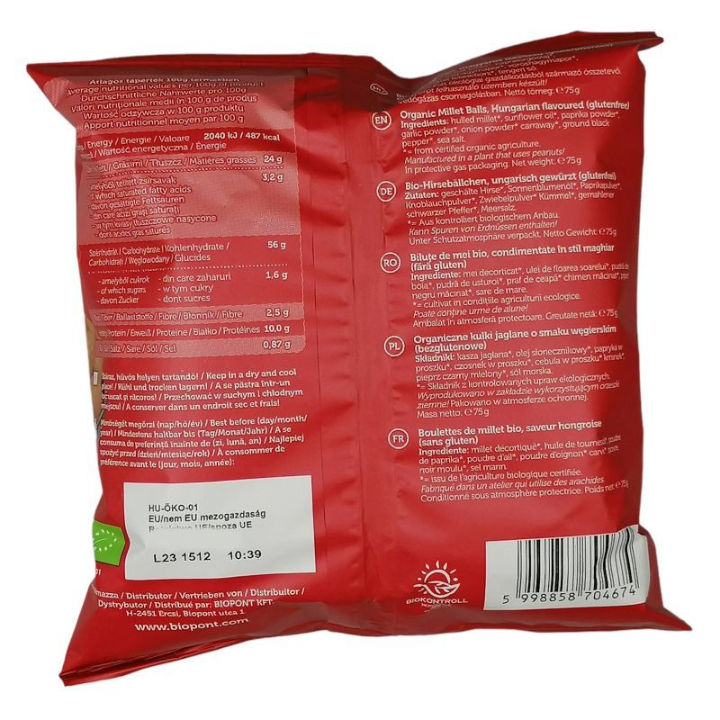 Összetevők: hántolt köles*, napraforgóolaj*, magyaros fűszerkeverék* 1,8% (piros fűszerpaprika őrlemény*, fokhagymapor*, vöröshagymapor*, kömény*, őrölt feketebors*), tengeri só. *Ellenőrzött ökológiai gazdálkodásból származó alkotó.