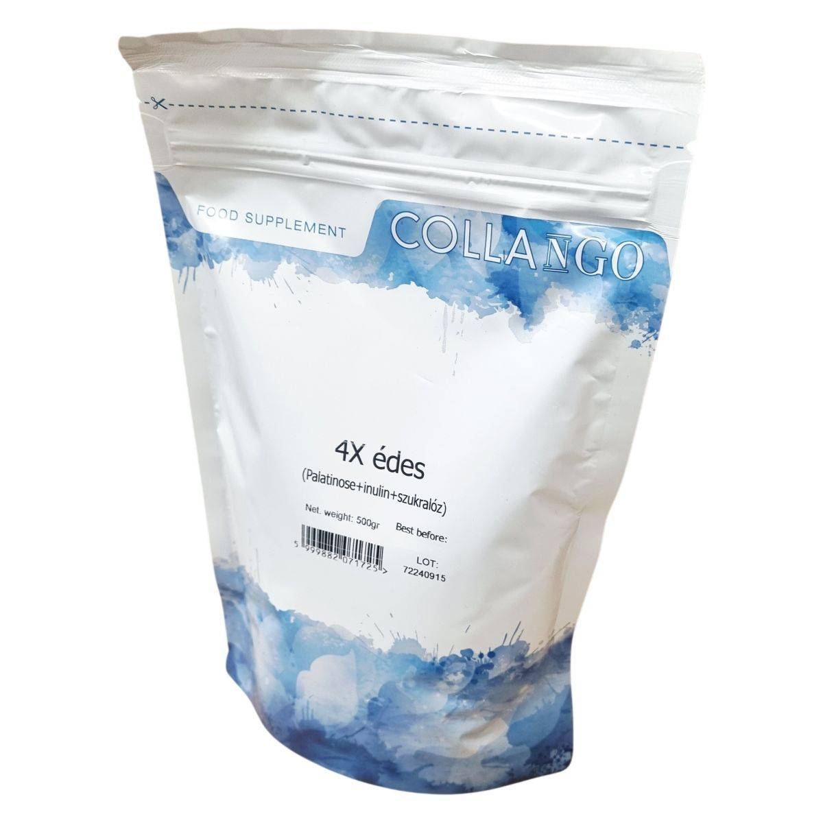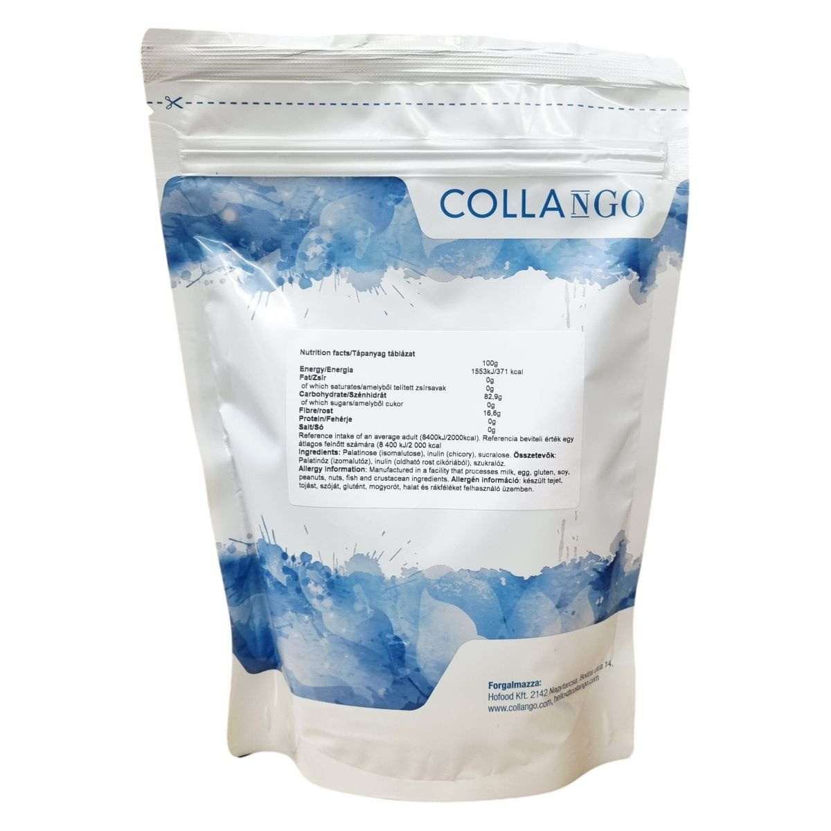 A COLLANGO termék 500 grammos kiszerelésben kapható táplálékkiegészítő, amely palatinózt, inulint és szukralózt tartalmaz. Az összetevők közül a palatinóz egy lassan felszívódó szénhidrát, az inulin oldható rost forrás cikóriából, míg a szukralóz egy kalóriamentes édesítőszer. Az allergén figyelmeztetés szerint a termék olyan üzemben készül, ahol tej, tojás, szója, glutén, mogyoró, hal és rákfélék is feldolgozásra kerülnek. A tápanyag-összetétel alapján a termék energiaértéke 371 kcal 100 grammonként, zsiradékot, cukrot és fehérjét nem tartalmaz, viszont jelentős rosttartalommal rendelkezik. A COLLANGO a Hofood Kft. forgalmazásában érhető el.