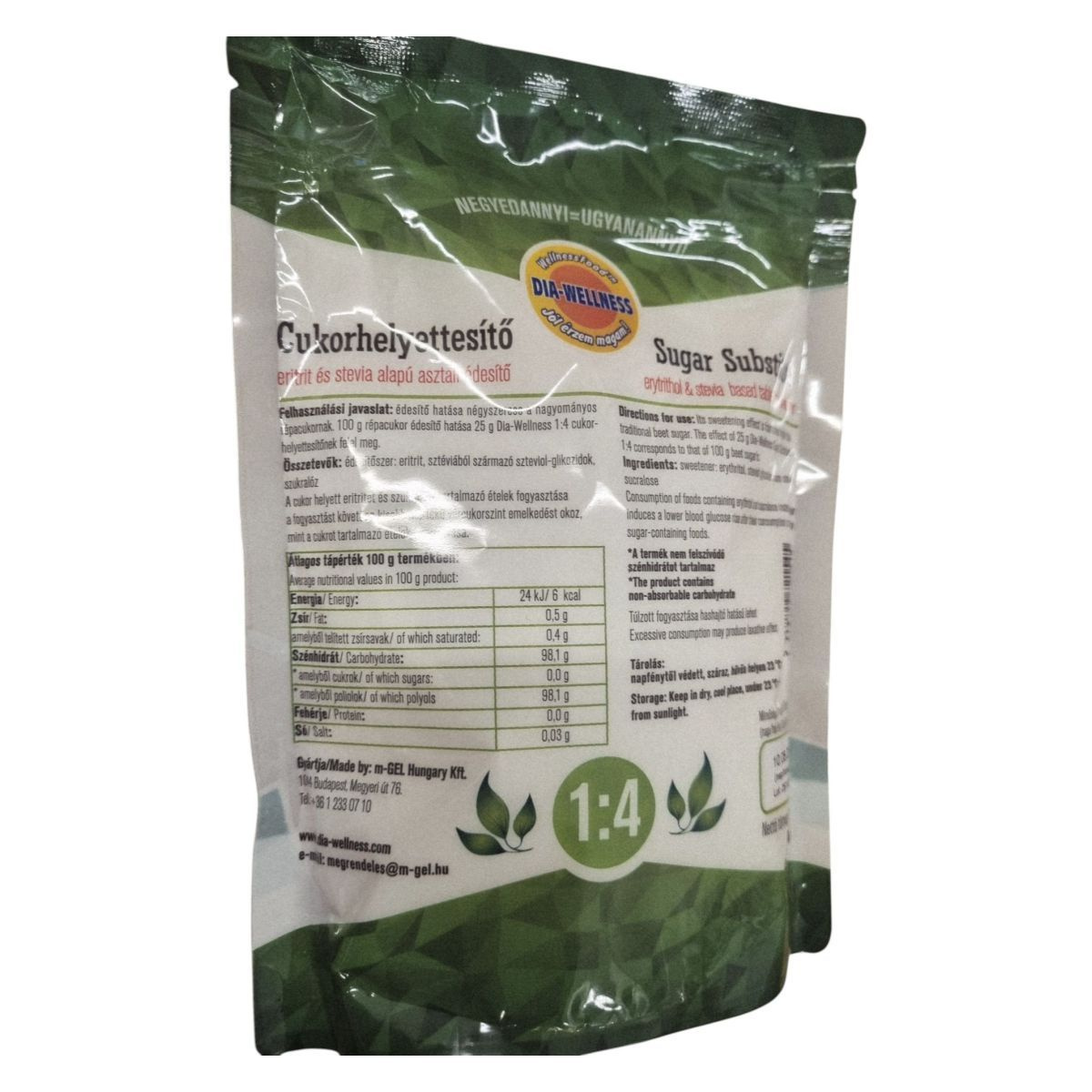 Édesítő hatása négyszerese a kristálycukorénak. 25 g Dia-Wellness 1:4 cukorhelyettesítő kb. 100 g cukor édesítőhatásának felel meg.