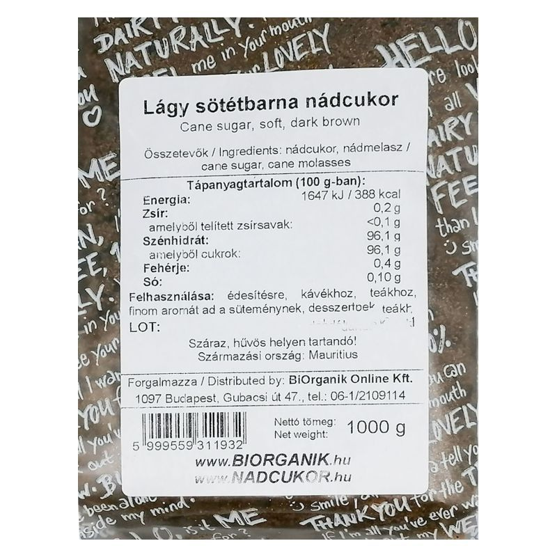 Frissen aratott, hagyományosan művelt cukornádból nyert édesítőszer. Sötét színét magas nádmelasz tartalmának köszönheti. Felhasználása: édesítésre, kávékhoz, teákhoz, finom aromát ad a süteménynek, desszertnek. Összetevők: nádcukor. Tápanyagtartalom 100 g termékben: Energia: 1600 kJ/400 Kcal, fehérje: <0,22 g, szénhidrát: 99,9 g, zsír: 0 g.