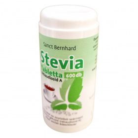 A Stevia (Stevia rebaudiana Bertoni) Paraguayból származó növény, amely meglepő édesítő erejét a levelekben található szteviol-glikozidnak köszönheti. A Sanct Bernhard Stevia Tabletta egy praktikus, könnyen adagolható cukorpótló, amely szteviol-glikozid és szorbit alapú. A termék gyakorlatilag kalóriamentes, nem befolyásolja a vércukorszintet, így cukorbetegek számára is ajánlott lehet. A szorbit tartalma miatt nagyobb mennyiségben hashajtó hatású lehet. A termék 600 tablettát tartalmaz, ami 40 grammnak felel meg.