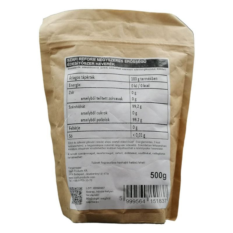 Szafi fitt "0" kalóriás cukorhelyettesítő eritritollal és sztíviával, 0% felszívódó szénhidráttartalommal. Cukorbetegek és fogyókúrázók is fogyaszthatják. Mivel mesterséges édesítőt (szukralózt) nem tartalmaz, így jobban dominál a stevia íze, mint egy szukralózzal betakart édesítő. Viszont a jó hír az, hogy sütés után teljesen elveszíti a stevia kesernyés ízét!