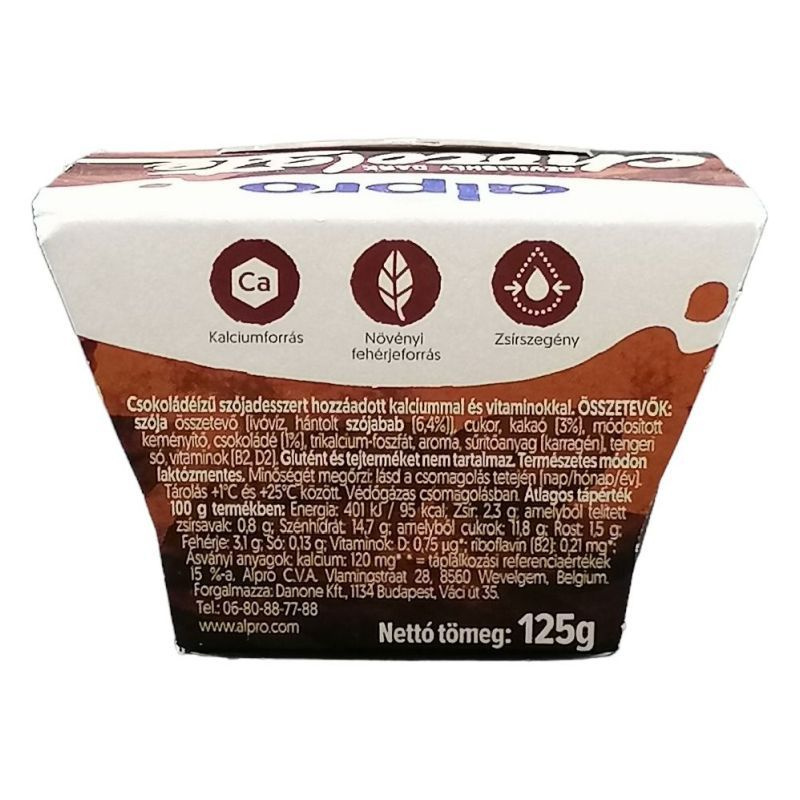 Az Alpro növényi alapú termékcsaládjának mesés dessztertje 100%-ban növényi alapú, vegán, természetes módon laktózmentes. Intenzív étcsoki ízre vágysz? Add át magad ellenállhatatlan desszertünknek. Jó úton jársz! A termék kalciumforrás. A kalcium szükséges a normál csontozat fenntartásához. A változatos és kiegyensúlyozott táplálkozás, valamint az egészséges életmód ajánlott a jó közérzethez.