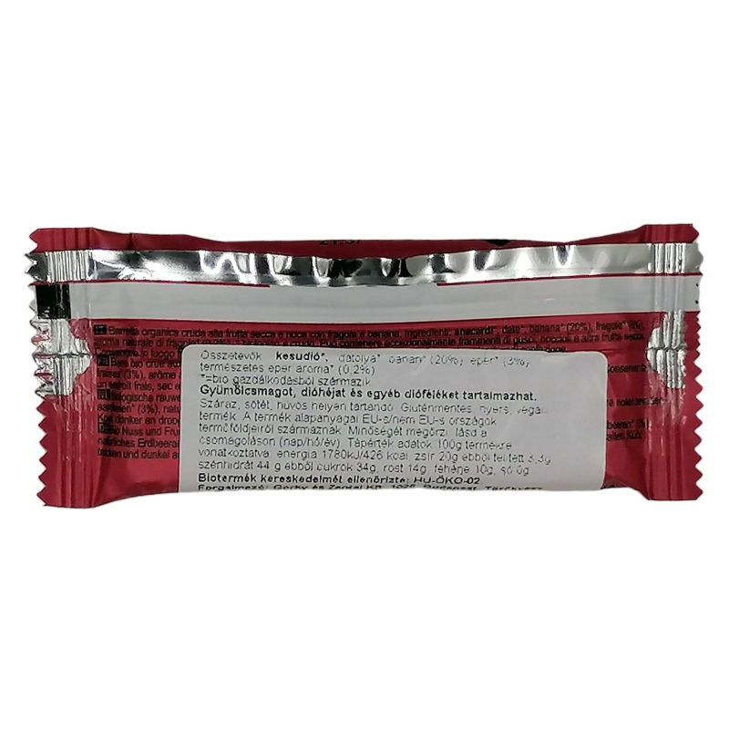 Összetevők: kesudió*, datolya*, banán*(20%), eper*(3%)* biogazdálkodásból származó nyersanyagok