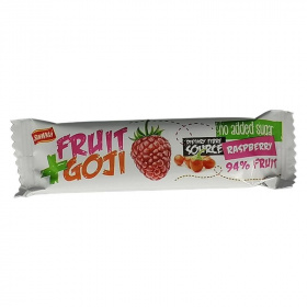 Aszalt datolya, málna és goji alapú szelet, természetes cukrokkal és hozzáadott édesítés nélkül.