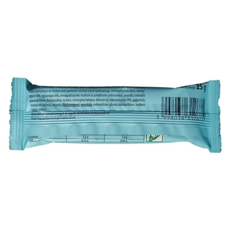 Összetétele: édesítőszer (maltit), kakaós tejbevonó massza édesítőszerrel [édesítőszer (maltit), teljes mértékben és részben hidrogénezett növényi zsírok (pálmamag, szorbitan-trisztearát), zsírszegény kakaópor, sovány tejpor 8%, édes tejsavópor 8%, emulgeálószerek (lecitin és poliglicerin poliricinoleát), aroma], extrudált gabonapelyhek (kukoricadara, búzadara, zsírszegény kakaópor, étkezési só), kókuszreszelék 11%, lapított zabpehely, növényi zsír (pálma), mazsola, földimogyoró, mandula, nedvesítőszer (glicerin), emulgeálószer (szójalecitinek), aroma. A termék szezámmagot és egyéb dióféléket tartalmazhat! Nagyobb mennyiség fogyasztása hashajtó hatású lehet!