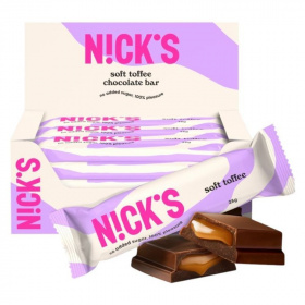 Nick's tejkaramellás szelet 28 g - gluténmentes, hozzáadott cukor nélkül készült, prebiotikus összetevővel. Cukor helyett stevia, eritrit és xilit keveréke került felhasználására, mesterséges édesítőszert nem tartalmaz. Lágy tejkaramellás töltelék tejcsokoládéban, megújult recept alapján. A hozzáadott cikóriagyökér rostnak köszönhetően prebiotikus hatású is.