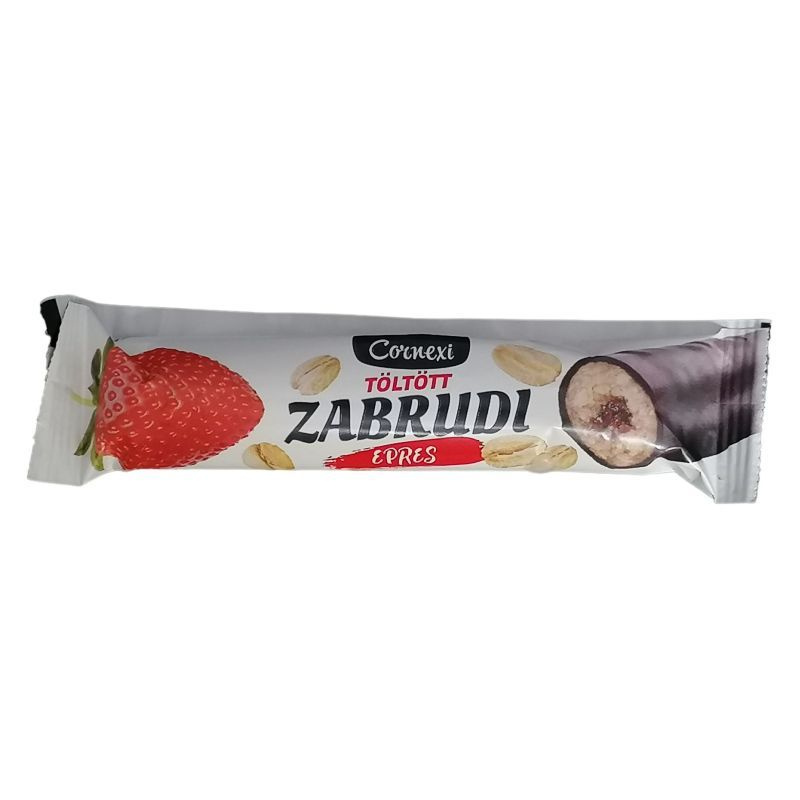 Zabpehelyből készült rudacska, amely epres tölteléket és kakaós bevonatot tartalmaz, így rostforrásként is szolgálhat.