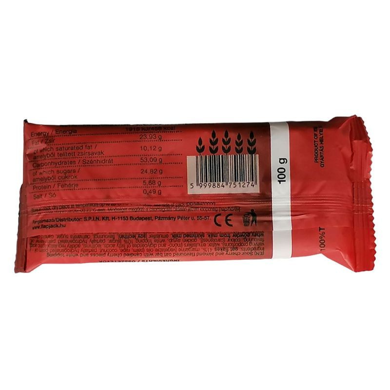 Meggyízű mandulás zabszelet kandírozott cseresznyedarabokkal, fehér bevonóba mártva.