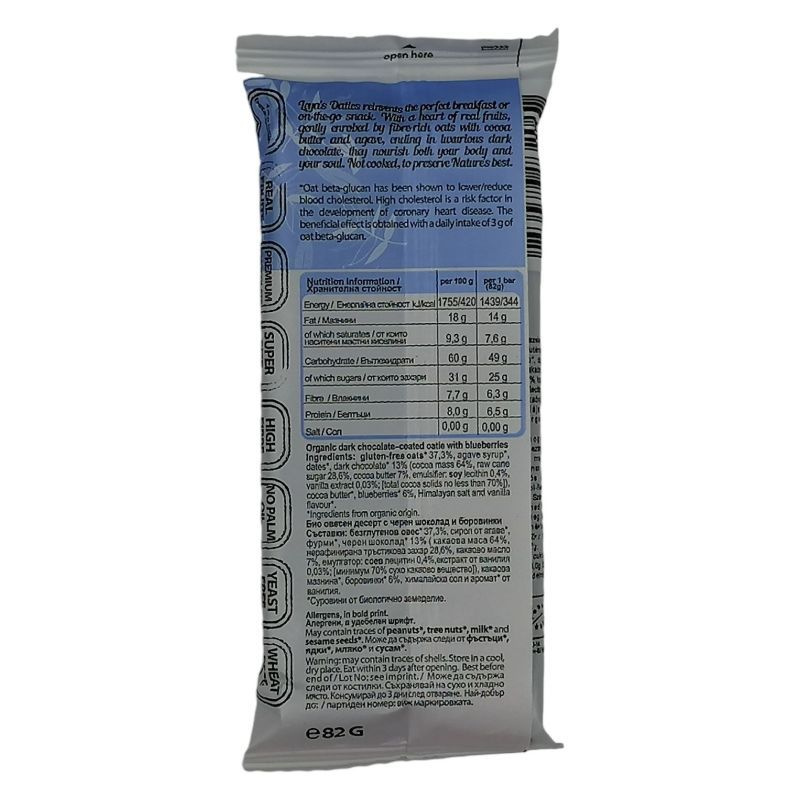 Összetevők: Gluténmentes zab* 37,3%, agavészirup*, datolya*, étcsokoládé* 13% (kakaómassza 64%, nyers nádcukor 28,6%, kakaóvaj 7%, emulgeálószer: szójalecitin 0,4%, vaníliakivonat 0,03%), kakaóvaj*, kék áfonya* 6%, Himalája só, vaníliaaroma*. *organikus gazdálkodásból.