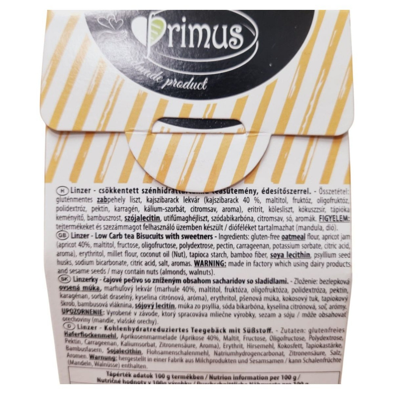 A Primus Linzer egy kézzel készített, csökkentett szénhidráttartalmú teasütemény, amely édesítőszerrel készül. Gluténmentes zabpehely liszt és kajszibarack lekvár felhasználásával készült, így azok számára is ideális lehet, akik gluténmentes étrendet követnek. A termék természetben előforduló cukrokat tartalmaz, és nagyobb mennyiség fogyasztása hashajtó hatású lehet. Tárolása száraz, napfénytől védett helyen ajánlott, 25°C alatt. A termék tejtermékeket és szezámmagot felhasználó üzemben készült, és dióféléket is tartalmazhat.