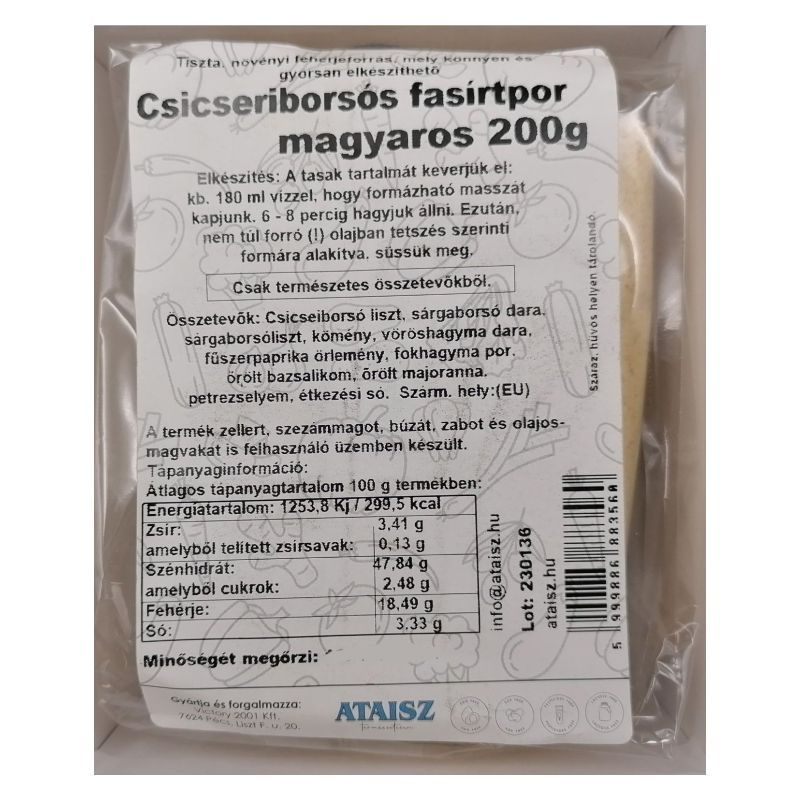 Ez a por a csicseriborsóból készült, amely egy rendkívül tápláló hüvelyes. Az elkészítése során a por vízzel és fűszerekkel keverendő, majd formáját tekintve fasírtokká alakítható. A sütés során a fasírtok ízletes és ropogós héjat kapnak, míg belül puha és ízletes marad. Használj különböző fűszereket és zöldségeket, hogy minden alkalommal új ízeket varázsolj az asztalra.