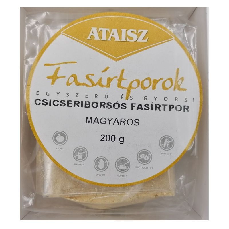 A fasírtpor csicseriborsólisztből, hagymaporból és magyaros fűszerekből áll, tojásmentes formában.