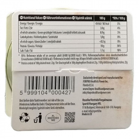 Tápérték adatok 100 g termékben: Energia: 434 kJ/ 103 Kcal, zsír: 3,0 g -ebből telített zsírsav: 0,9 g, szénhidrát: 1,0 g -ebből cukor: <0,5 g, fehérje: 18 g, só: 1,1 g.