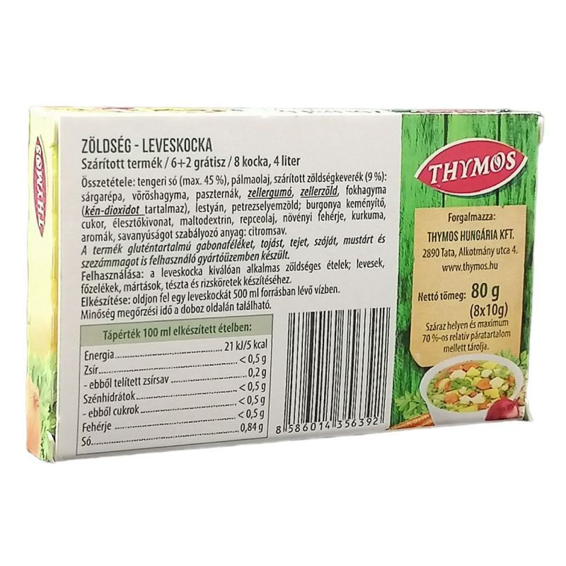 A Thymos nátrium-glutamát mentes zöldség leveskocka egy kiváló választás mindazok számára, akik szeretnék ízletesebbé tenni ételeiket anélkül, hogy mesterséges adalékanyagokat használnának. Ez a termék a természetes zöldségek ízét és aromáját hozza el a konyhádba, lehetővé téve, hogy minden étkezés egyedi és ízletes legyen. A leveskockák praktikus formája megkönnyíti a használatot, hiszen bármikor, bármilyen ételhez hozzáadhatók. A csomag 6 db + 2 db extra kockát tartalmaz, így hosszabb ideig élvezheted a friss zöldségek ízét. A leveskockák nemcsak ízesítésre alkalmasak, hanem segítenek abban is, hogy a főzés gyorsabb és egyszerűbb legyen, hiszen nem kell külön zöldségeket előkészíteni. A Thymos zöldség leveskocka ideális választás lehet vegetáriánusok és vegánok számára is, mivel nem tartalmaz állati eredetű összetevőket, és a nátrium-glutamát mentes formulája miatt egészségesebb alternatívát kínál a hagyományos leveskockákkal szemben.